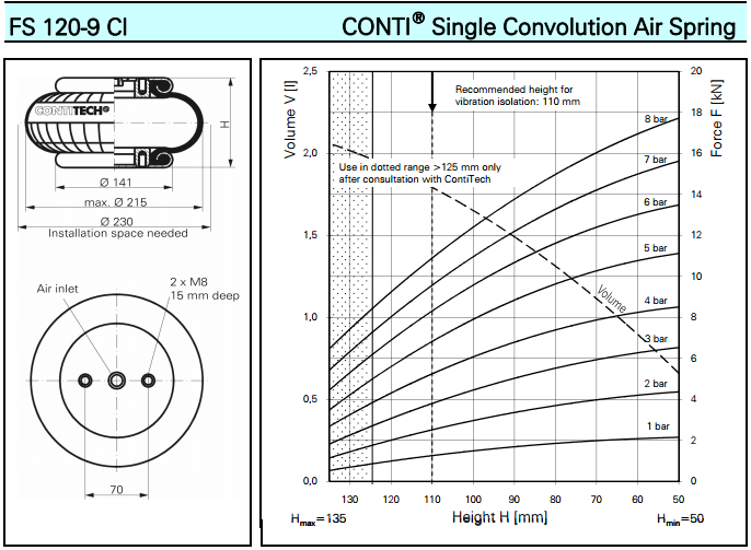 橡膠氣囊工作時,內腔充入壓縮空氣,形成一個壓縮空氣氣柱。隨著振動載荷量的增加,彈簧的高度降低,內腔容積減小,彈簧的剛度增加,內腔空氣柱的有效承載面積加大,此時彈簧的承載能力增加。當振動載荷量減小時,彈簧的高度升高,內腔容積增大,彈簧的剛度減小,內腔空氣柱的有效承載面積減小,此時彈簧的承載能力減小。這樣,空氣彈簧在有效的行程內,空氣彈簧的高度、內腔容積、承載能力隨著振動載荷的遞增與減小發(fā)生了平穩(wěn)的柔性傳遞、振幅與震動載荷的高效控制。還可以用增、減充氣量的方法,調整彈簧的剛度和承載力的大小,還可以附設輔助氣室,實現(xiàn)自控調節(jié)。